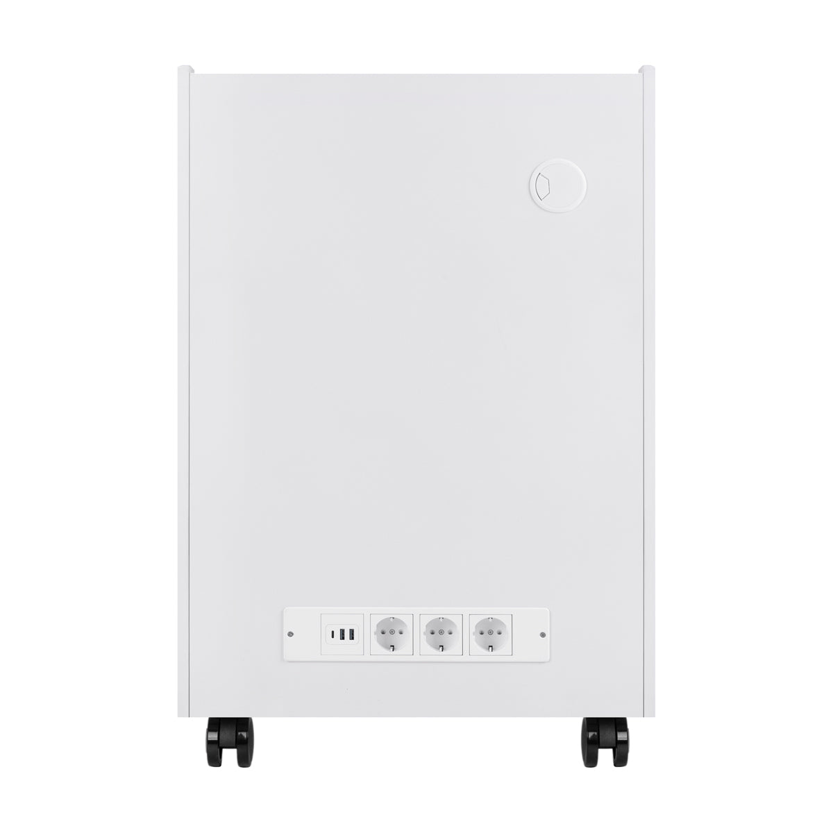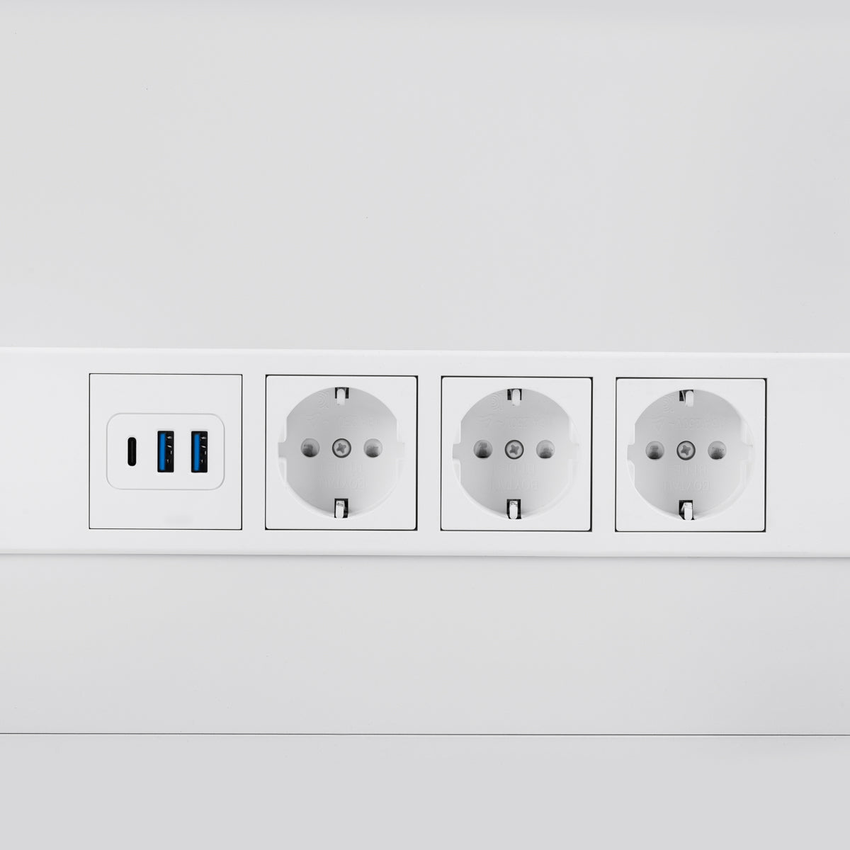 El asistente cuenta con un panel trasero con tres enchufes de red, dos puertos USB y un puerto USB-C, lo que permite la conexión cómoda de diversos tipos de dispositivos. Las gomas para cables ubicadas en las paredes cerca del cajón superior ayudan a mantener el orden. El soporte integrado para lámpara con lupa permite fijar el brazo de la lámpara de forma segura cerca del área de tratamiento sin ocupar espacio en la superficie de trabajo, favoreciendo una iluminación precisa y un trabajo ergonómico.