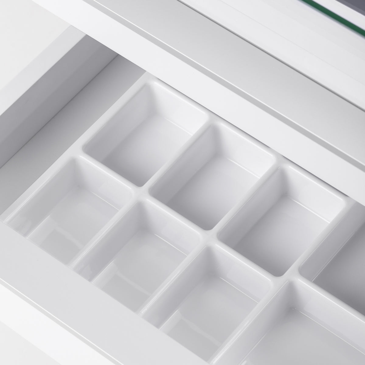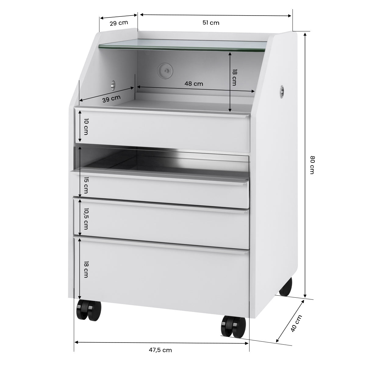La estrecha repisa superior de cristal permite el almacenamiento cómodo de los accesorios más usados. El armario cuenta con cuatro cajones de distintos tamaños, lo que facilita el almacenamiento ordenado de herramientas y productos cosméticos. El fondo espejado de uno de los cajones y un organizador interno dedicado facilitan una mejor organización de las herramientas, asegurando un acceso rápido a los accesorios esenciales y aumentando la comodidad durante los tratamientos. La altura del cajón superior abierto permite colocar equipos esenciales, como un taladro para uñas con absorbedor.