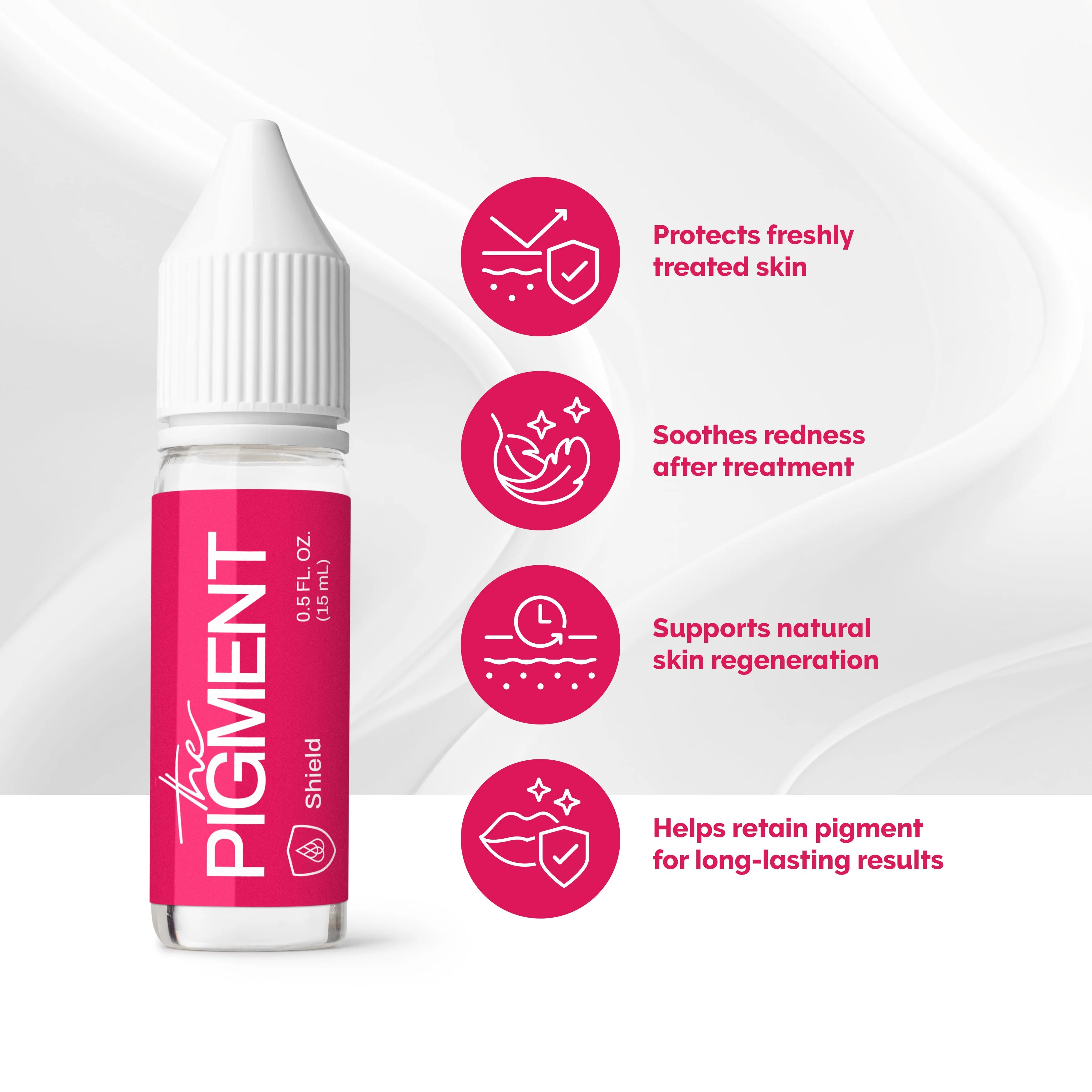 The Pigment Shield 15ml está especialmente formulado para el cuidado posterior tras procedimientos de PMU y microblading. Su textura rica y transparente crea una película protectora sobre el área tratada, protegiendo el pigmento recién implantado. La fórmula también ayuda a calmar el enrojecimiento y apoya el proceso natural de regeneración de la piel.
