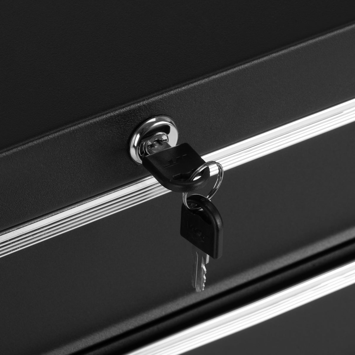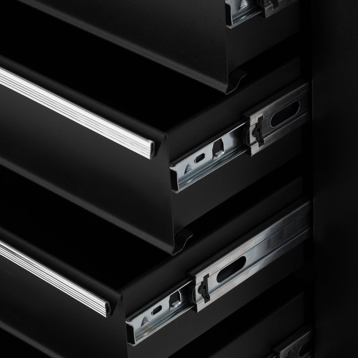 El modelo está equipado con cinco cajones espaciosos, que proporcionan amplio espacio para las herramientas necesarias, productos de higiene y accesorios desechables. La distribución bien pensada promueve el orden y la correcta organización del espacio de trabajo. Una cerradura con llave evita que los cajones se abran de forma descontrolada y permite almacenar equipos más delicados o documentación.